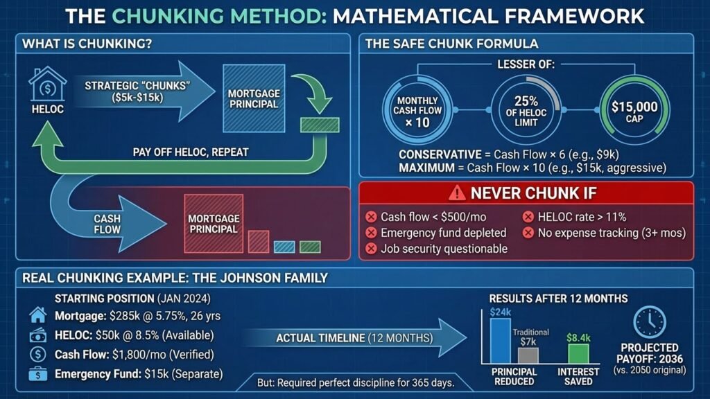 Instead of making tiny extra payments, you deploy strategic “chunks” of $5,000-$15,000 directly to principal, then use cash flow to pay off the HELOC, then repeat—but only when mathematically optimal.